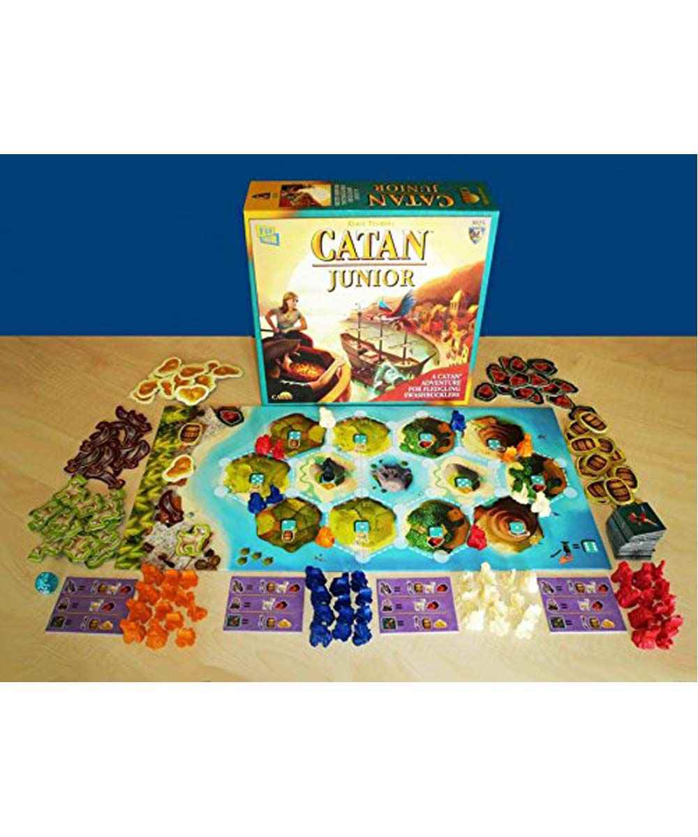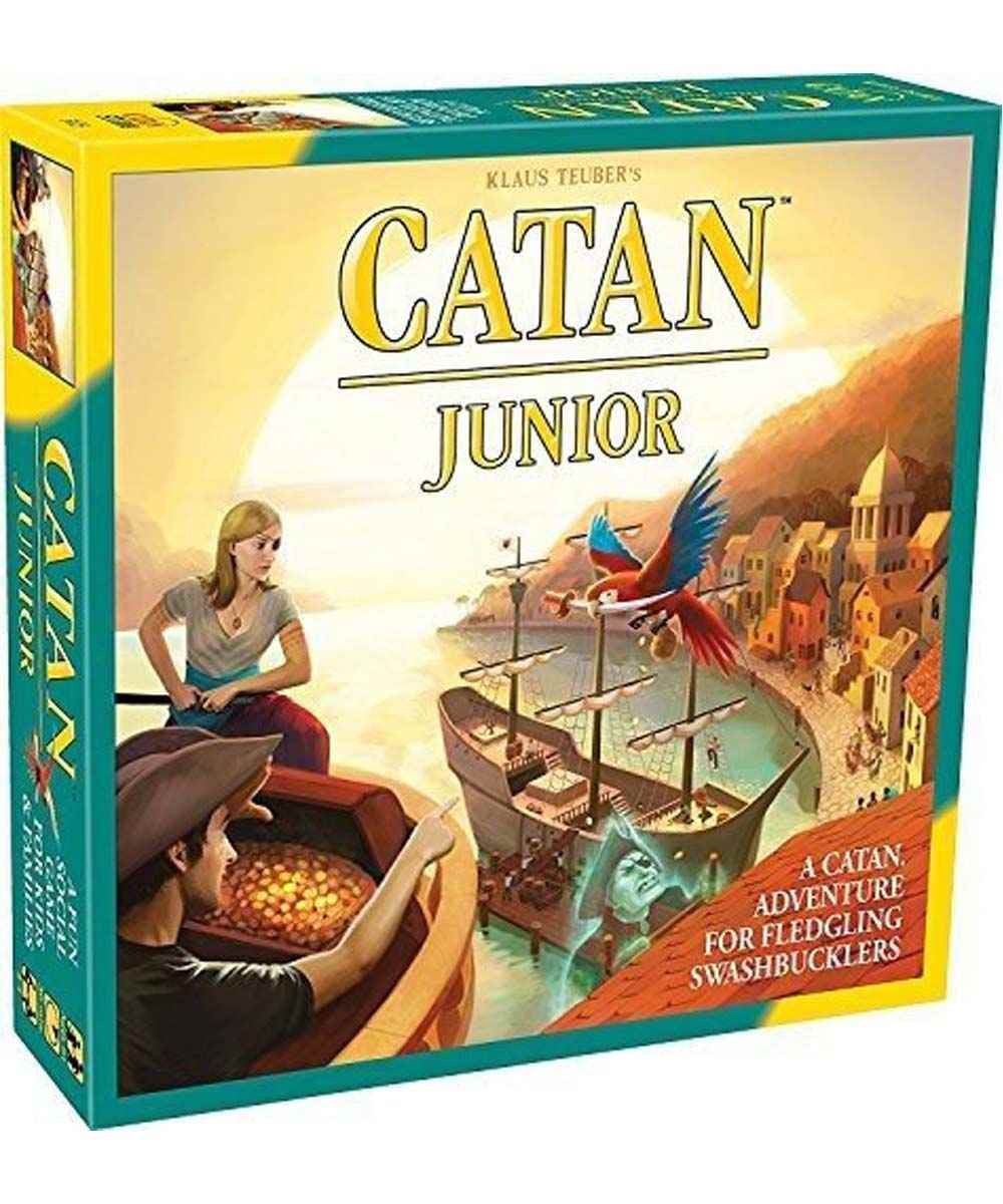 Explore the Seas Catan: Junior introduces a modified playing style of the classic game giving younger players the opportunity to experience the world of Catan. Designed for players as young as 5 and is a perfect introduction to the Catan series of games for kids and families. Catan: Junior takes place on a ring of islands where 2 to 4 players build hideouts, and the mysterious Spooky Island, where the Ghost Captain lives. Each island generates a specific resource: wood, goats, molasses or swords and players can acquire gold. Each player starts with two pirate hideouts, then builds ships in order to expand their network. The more hideouts you build, the more resources you may receive. You use your resources to build ships, hideouts or get help from Coco the Parrot. Just watch out for the dreaded Ghost Captain. Be the first player to control seven pirate hideouts and you win the game.