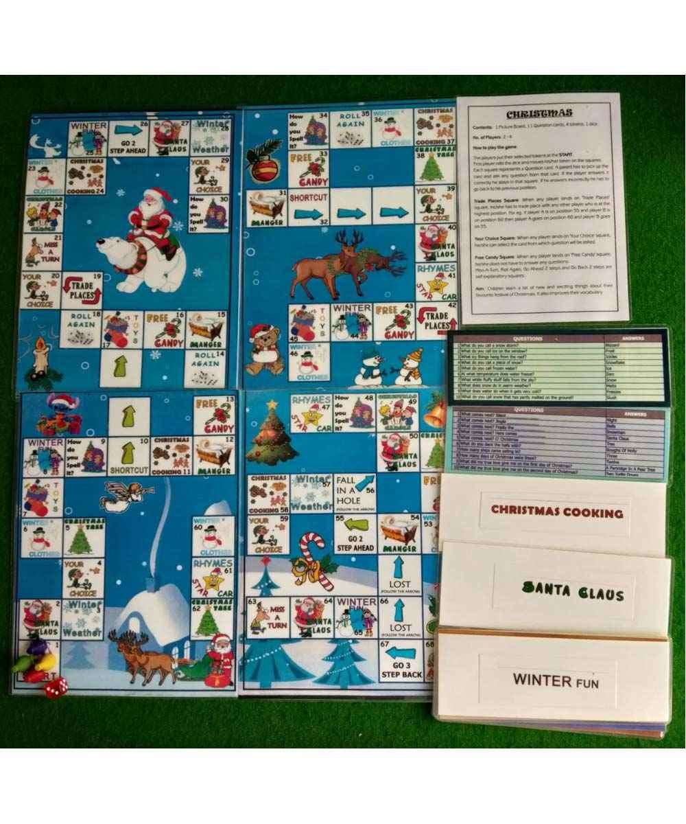 4 Boards, 11 cards,4 to kens, 1 ins.sheet, 1 dice
