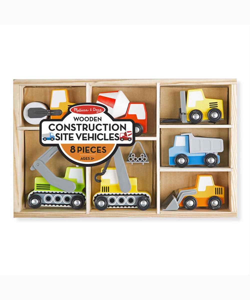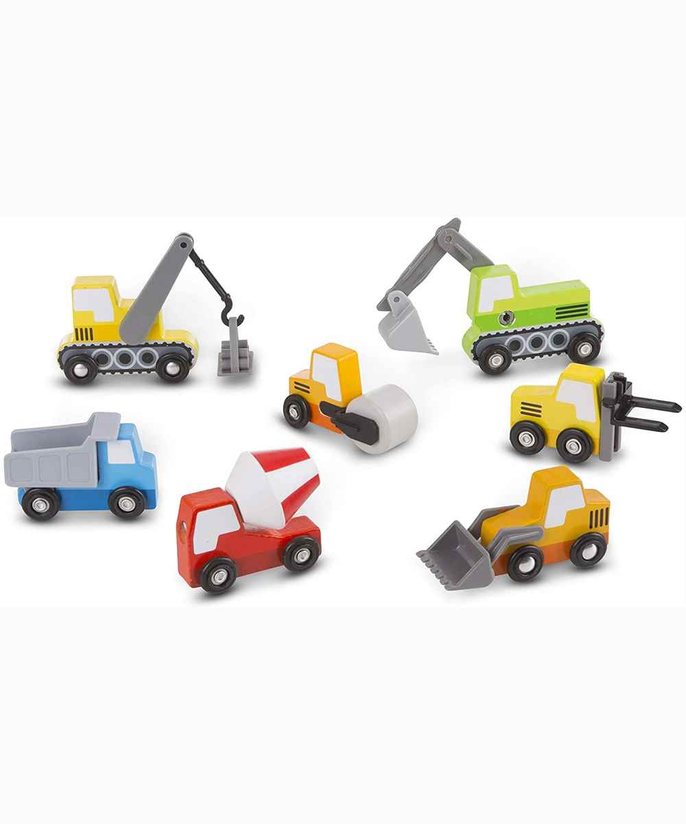 It?s time to get constructive fun rolling with these sturdy wooden vehicles The eight-piece set includes a steam roller, cement mixer, forklift, dump truck, front loader, crane, and backhoe, each approximately four inches long, and a construction piece to lift and load. All are brightly colored with lots of moving parts that are fun for kids three and older to grasp and maneuver. Designed to play perfectly with Melissa & Doug Activity Rugs, the construction vehicles store conveniently or can be displayed in the compartmentalized wooden tray.