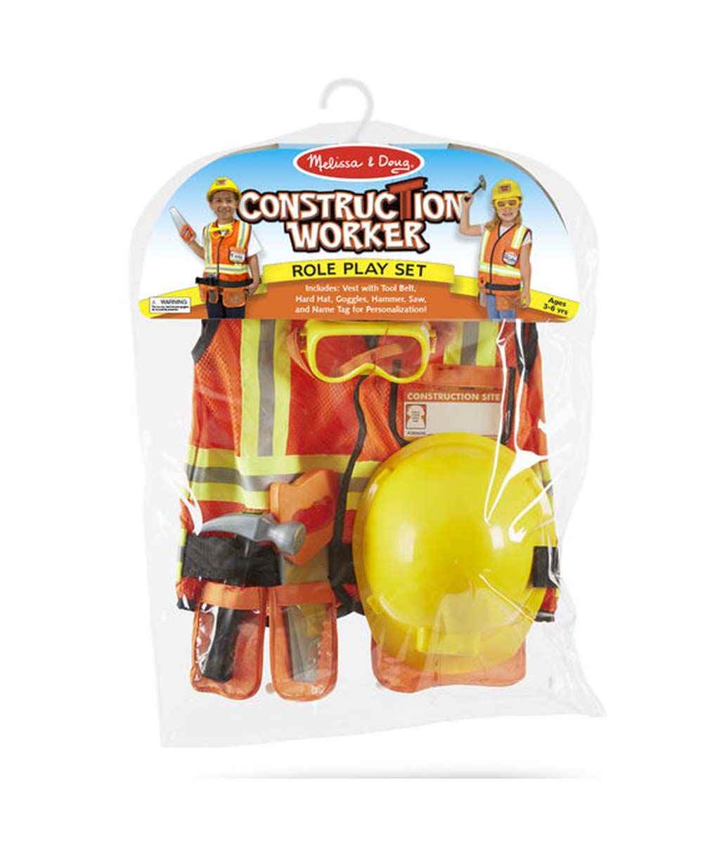 Work zone ahead! Your little construction worker will be ready for the job with this bright orange, machine-washable, vest high-lighted with reflective material and a tool belt, a yellow hard hat, “safety” goggles, a hammer, a saw, and a name tag for personalizing.