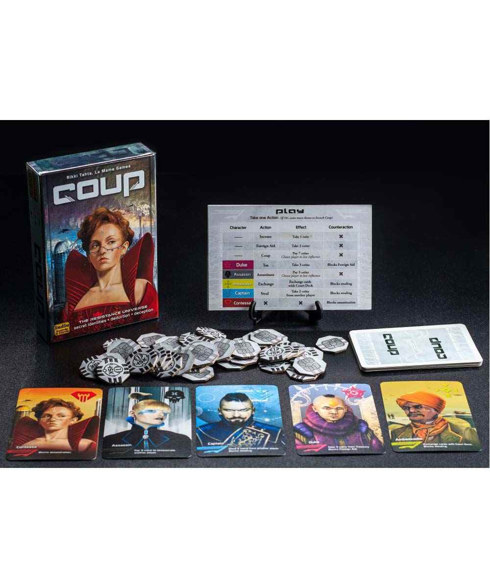You are head of a family in an Italian city state, a city run by a weak and corrupt court. You need to manipulate, bluff and bribe your way to power. Your object is to destroy the influence of all the other families, forcing them into exile. Only one family will survive. In coup, you want to be the last player with influence in the game, with influence being represented by face down character cards in your playing area. Each player starts the game with two coins and two influence i. E., Two face down character cards the fifteen card deck consists of three copies of five different characters, each with a unique set of powers duke take three coins from the treasury. Block someone from taking foreign aid. Assassin pay three coins and try to assassinate another player’s character. Contessa block an assassination attempt against yourself. Captain take two coins from another player or block someone from stealing coins from you. Ambassador draw two character cards from the court the deck, choose which if any to exchange with your face down characters, then return two. Block someone from stealing coins from you.