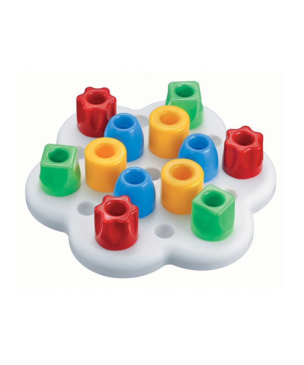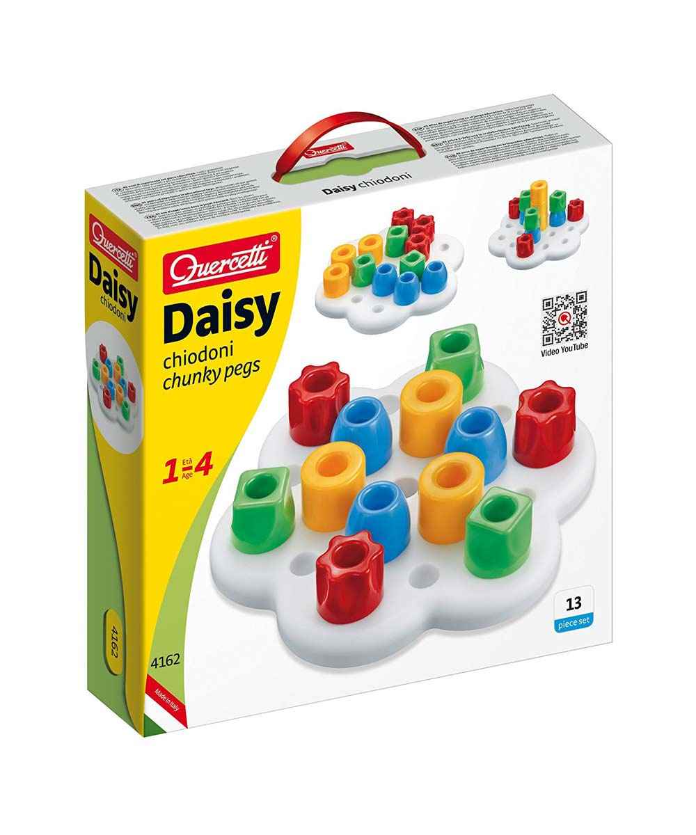 The Daisy Basic is an educational toy with colourful jumbo pegs that has been specifically designed to meet your child’s first developmental needs. Babies and toddlers will be fascinated by the stackable jumbo pegs with rounded edges that are made of a durable and totally safe material. They are soft and easy to hold and can be inserted in the perforated flower-shaped board or piled up to create higher and higher towers in total safety. The different shapes and colours stimulate visual perception, hand-eye coordination and develop fine motor skills