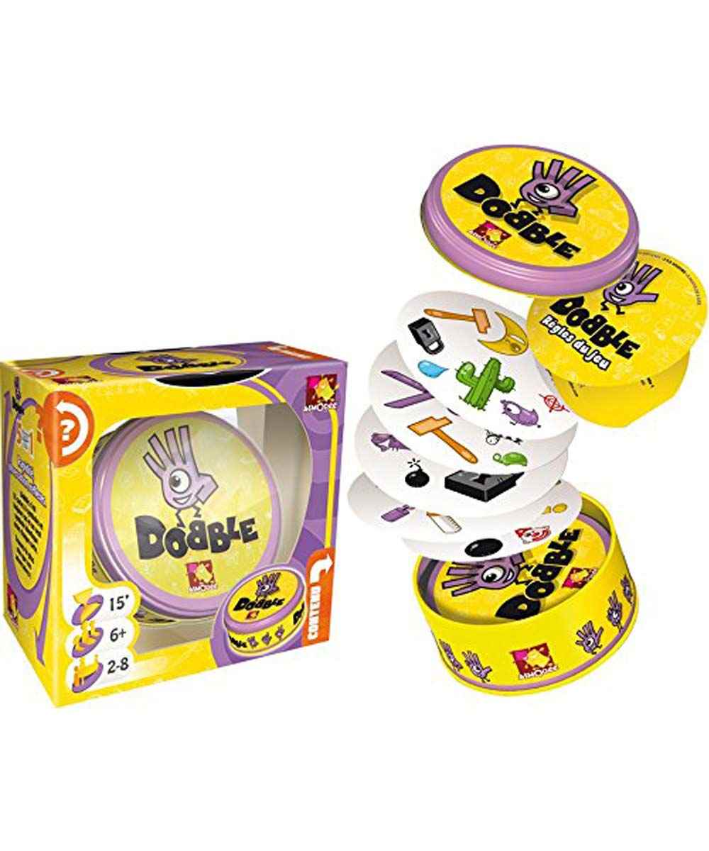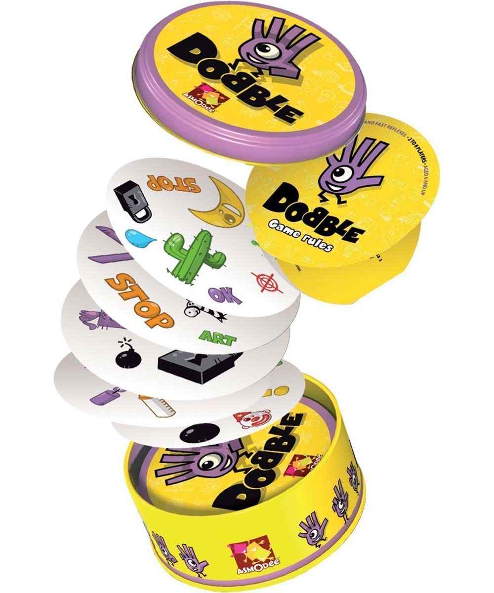 Dobble, a visual perception card game suitable for ages 6 and up in which players race to find the one matching image between one card and another. The images may be different sizes and placed on any part of the card, making them difficult to spot. The circular cards feature an assortment of colorful images of everyday items. Every card is unique and has only one picture in common with every other card in the deck.