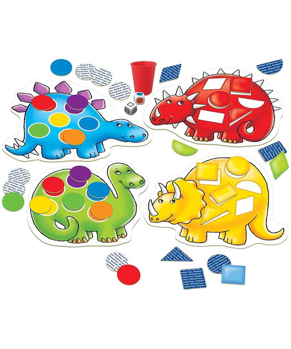 2 Points4 dinoasaur boards,24 shapes, 24 colours dots,1 shape dice, 1 colour dice,1 dice shaker, 1 ins sheet