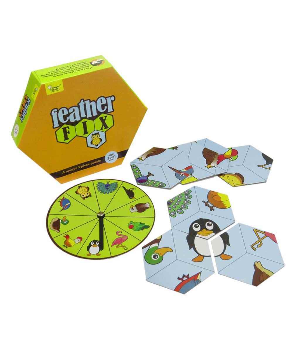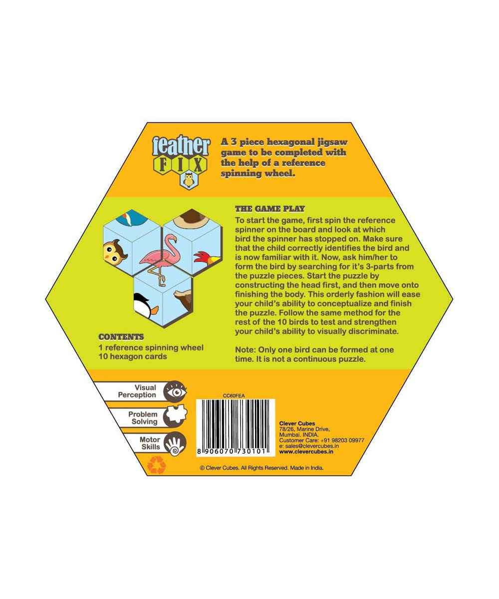 A 3-piece hexagonal jigsaw game to be completed using a reference spinning wheel.