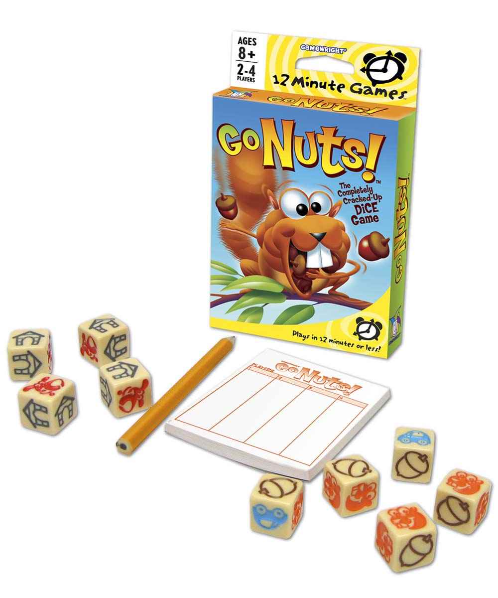 Take your cheeky chances on this quick playing dice game of nut gathering nuttiness. Pile up points by rolling the dice and adding up acorns, while avoiding any cars along the way. If you roll all squirrels, scurry to score as many nuts as you can before your opponents??? dogs chase you away! The player with the most points wins.