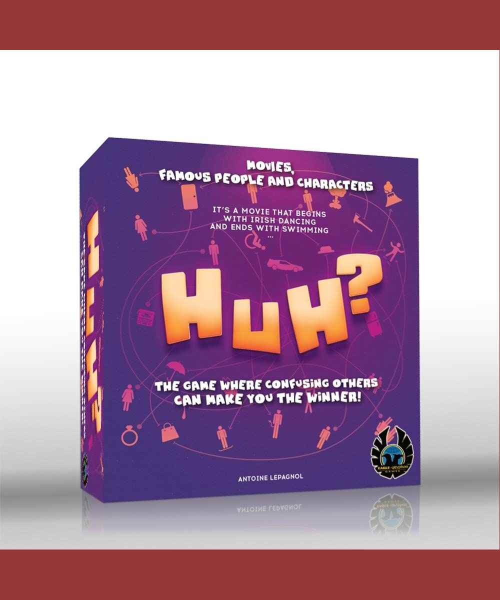 HUH? is a game in which confusing others can make you the winner! During the game, players attempt to describe movies, famous people, or characters in unusual and entertaining ways. Speak, act, sing — whatever you do, the goal is to have the fewest number of players possible understand what you are talking about! The fewer players who catch on, the better the score — but at least one person must figure out your clues.