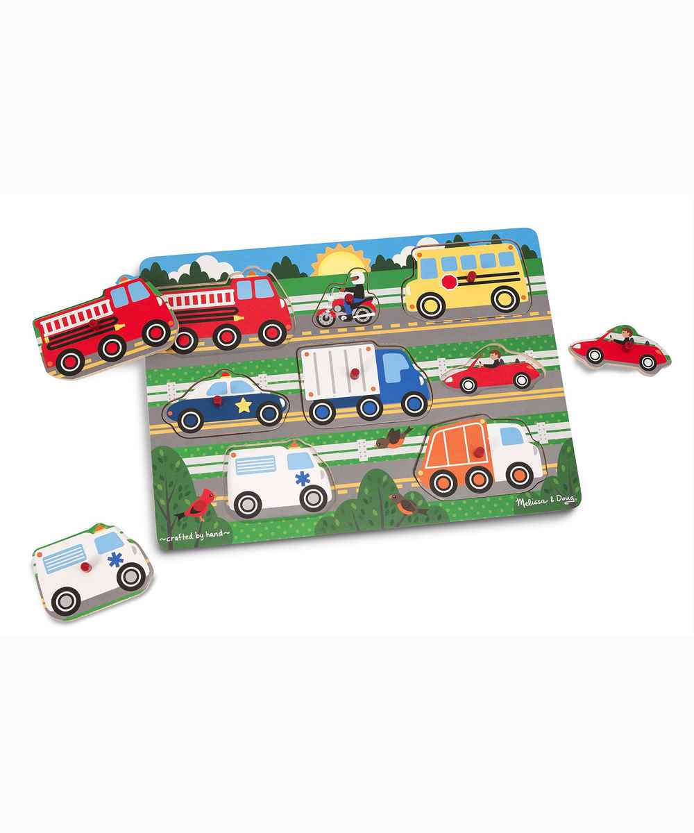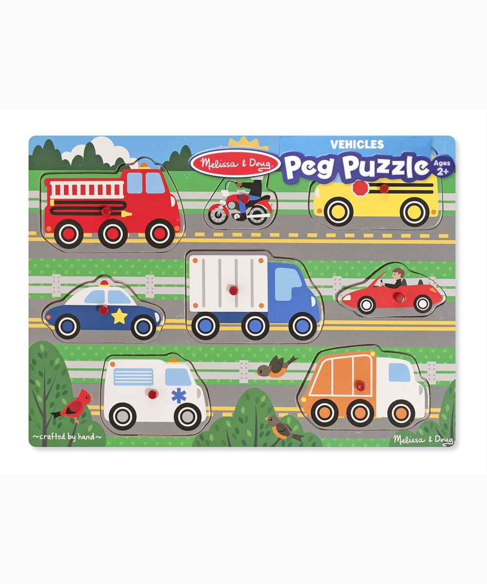 Children will learn to identify vehicles as they place each wooden puzzle piece over the matching picture on the puzzle board. This sturdy 8-piece puzzle features easy-grasp pegs and wooden construction. Promotes hand-eye coordination, fine motor skills, problem-solving skills, and much more!