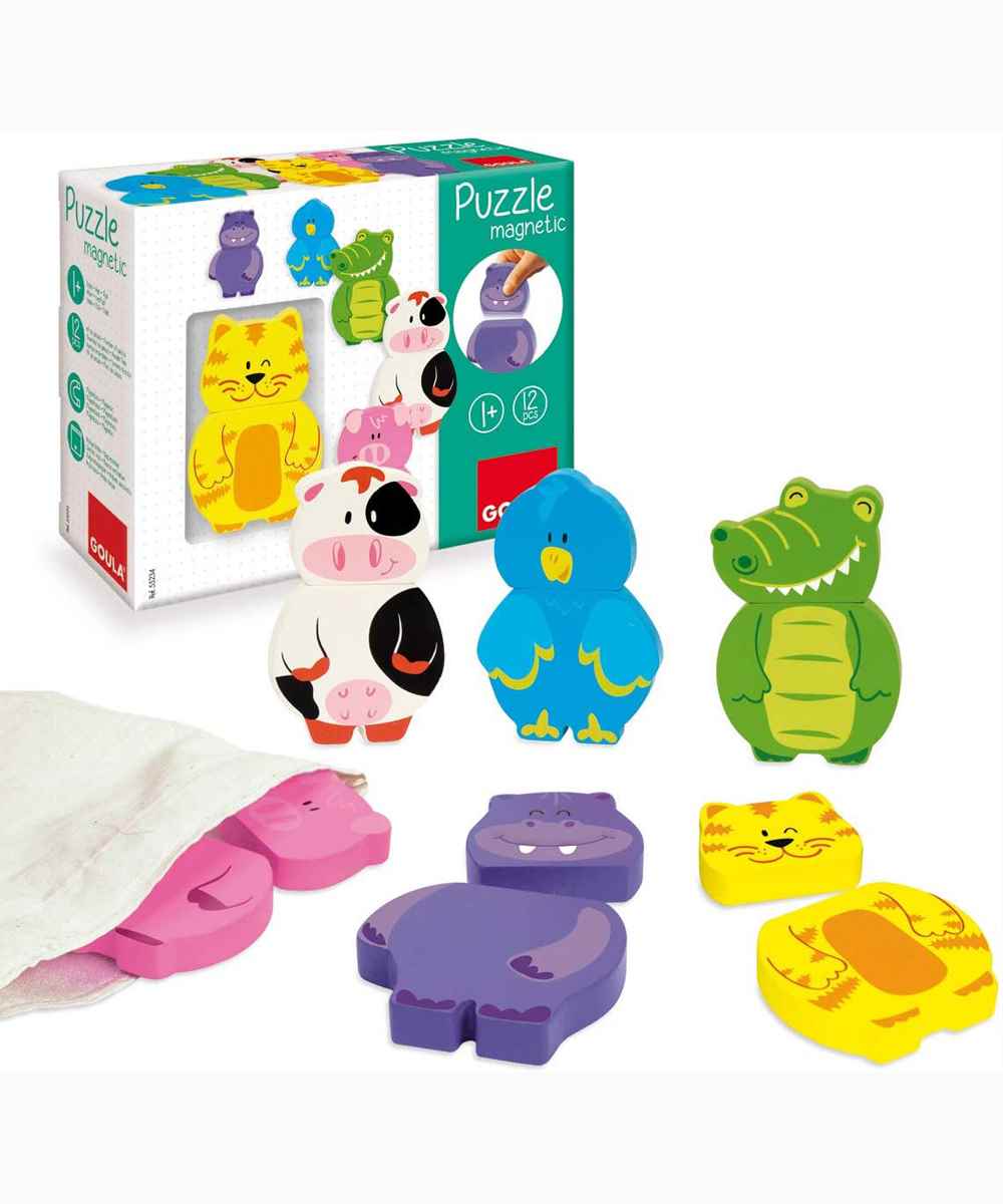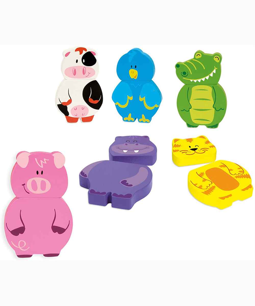 Bright, colourful wooden puzzles for children aged over 12 months. Young children like to put things together, but their dexterity and minor motor co-ordination need developing. These two piece, interchangeable, puzzles are great to help with these skills, as the head and body are connected by magnets, so your child will not need to align the two pieces precisely when they are first starting out.There are six different animals – Cow, Pig, Cat, Hippopotamus, Bird and Crocodile. Some your child will already be familiar with, and others they will be learning to recognise from picture books. Each animal is a different colour which will help your child to understand which head goes with which body, initially, and also gives an opportunity to recognise, and eventually name, different colours – another important skill for young children to learn.For added fun, the heads of each animal are interchangeable with the bodies of the other animals so your child can mix and match to create their own creatures as well.The set comes includes a fabric bag, with Velcro fastening, which makes it convenient to store, but also to take with you when travelling or visiting friends.Suitable for children aged 1+.