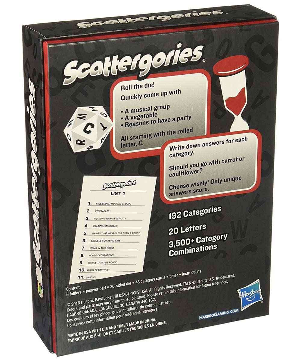 The Scattergories game is the fast-thinking game of categories and words! Roll the die, flip the sand timer, and think of answers to each category on the category list. Players race against the timer as they write down answers such as things in a musical group, a vegetable, a reason to have a party, and items found in a bakery — each beginning with the letter C. Score points for writing down things no one else did. The more creative the answers, the more points you score. With more than 190 categories and 20 letters on the die, the game is exciting to play over and over again.