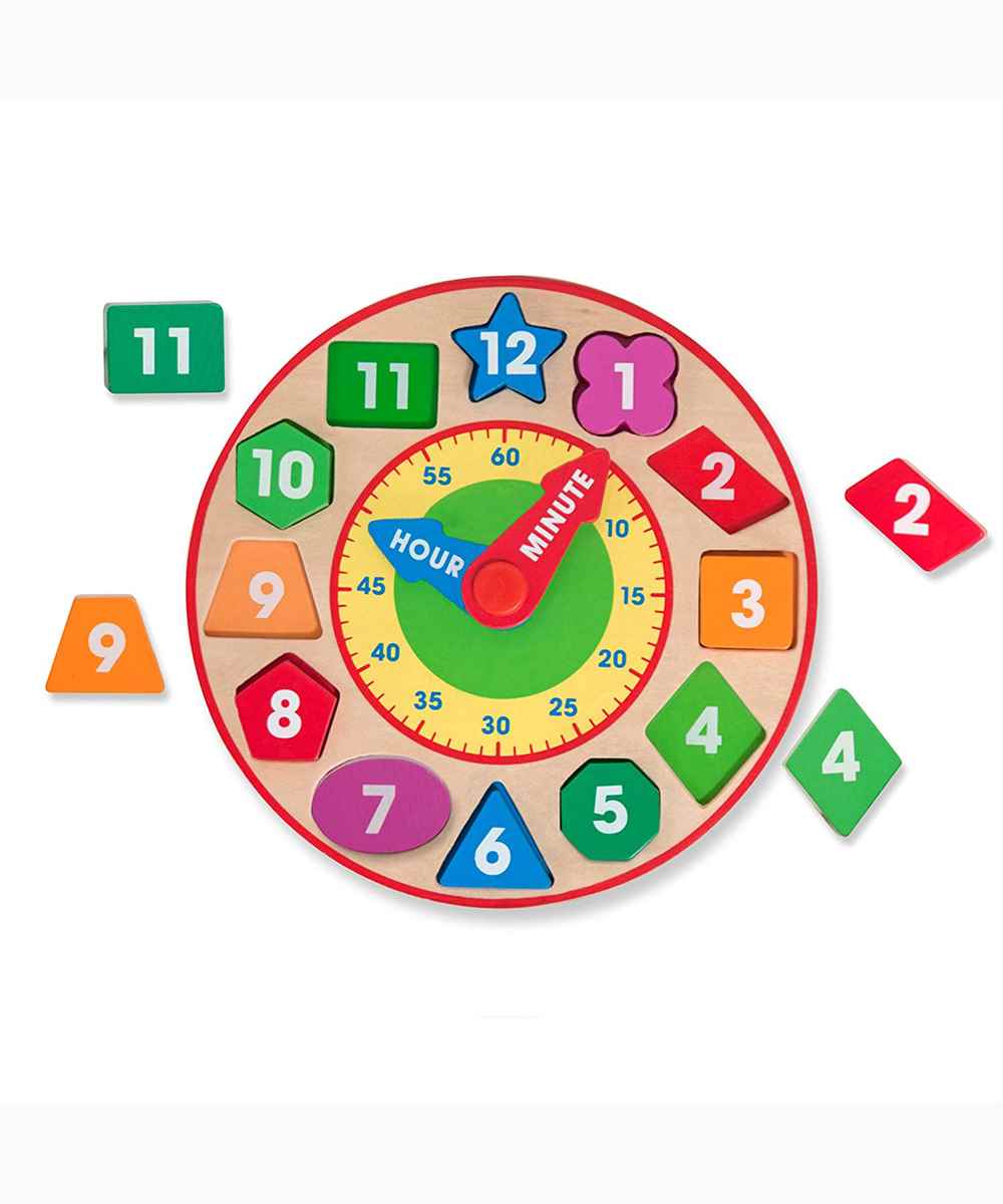 Our popular preschool-friendly clock gets a cool update! A larger face, exposed natural wood, and pops of vibrant color on match-able chunky pieces make for a fresh modern look . . . but the classic play value and top-quality construction remains the same. Kids love the color-coded minute and hour hands that spin around with a simple push. (No matter where they point, it’s always time for learning and fun!) Children can match the colors, sort the shapes, and solve the puzzle as they manipulate the color blocks and turn the hands, building cognitive and motor skills and laying the groundwork for learning to tell time. Activities printed right on the box encourage interactive play, helping children begin to master early-learning concepts as they gain familiarity with the form of a clock and concepts of time. The Melissa & Doug Shape Sorting Clock is made from smooth-sanded, solid-wood material and features rotating minute and hour hands, as well as 12 shaped number pieces that fit into recessed wells to teach fine motor skills, numbers, colors, shapes, and concepts of time. This Shape Sorting Clock makes a great gift for children ages 3 to 6.