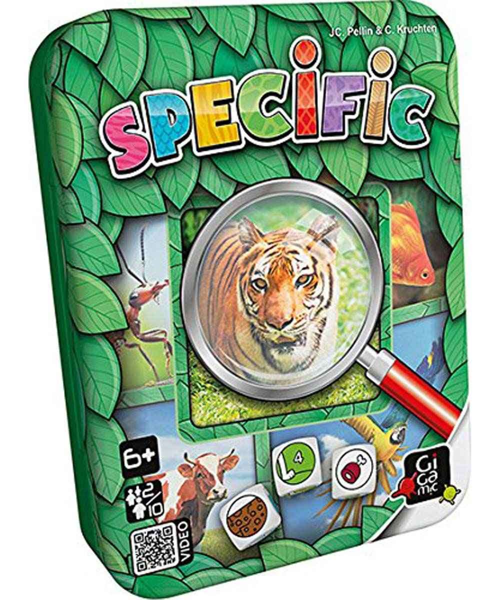 In Specific, players are on a hunt for animals that match the results gathered from 3 dice; habitat, diet and number of legs. Be the first to grab the correct animal! A great game to play with your animal loving kids!.