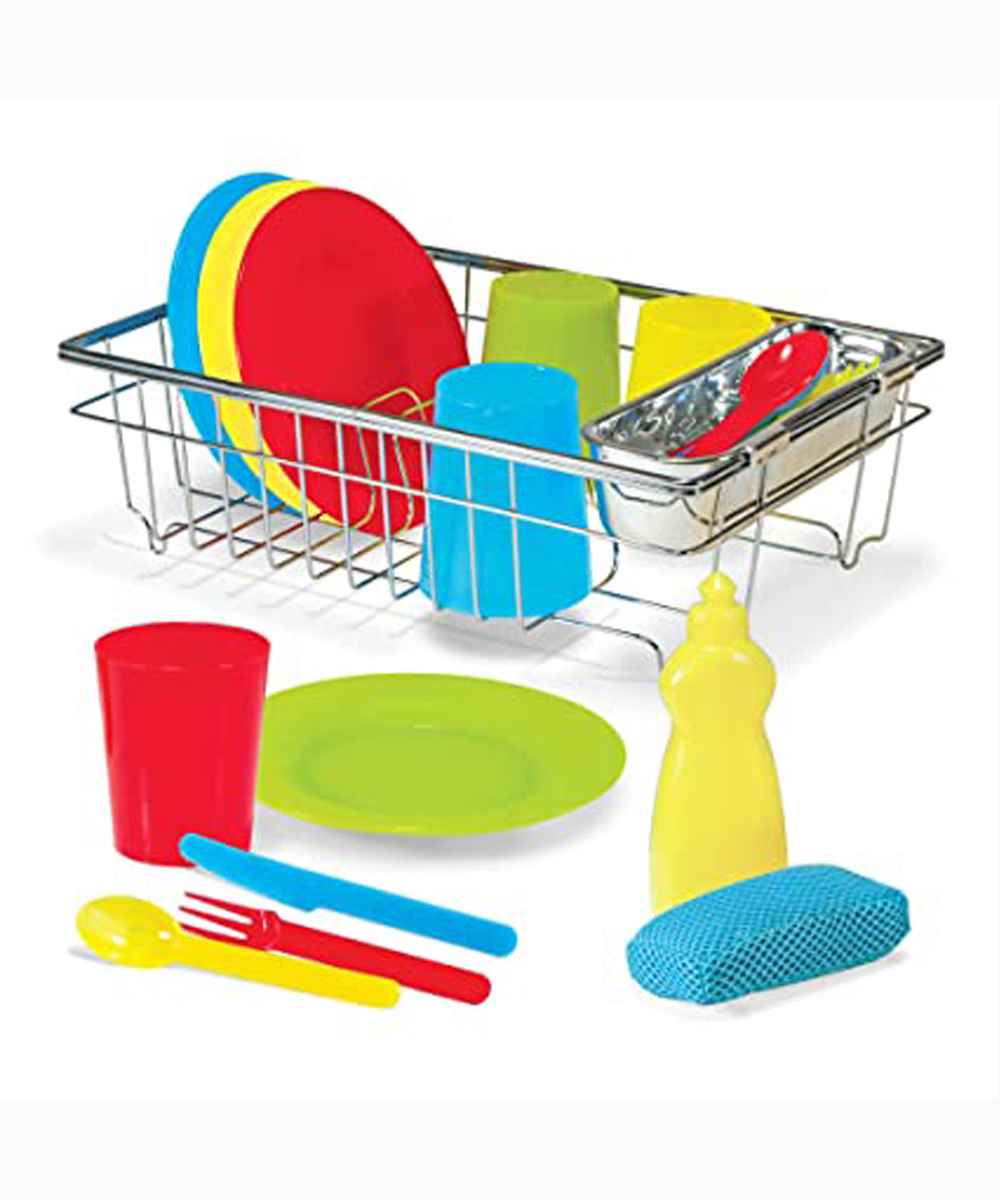 Set the perfect table for your play-food feasts and pretend parties! This sturdy play set comes with four plastic plates; four plastic cups four plastic forks spoons and knives; a squeezable soap bottle; a mesh-covered sponge; and a metal drying rack with utensil-holding insert. Add them to a play kitchen or use as a stand-alone play set–either way this appealing play set mimics the real-life objects and activities kids see around them helping build social skills encourage communication.