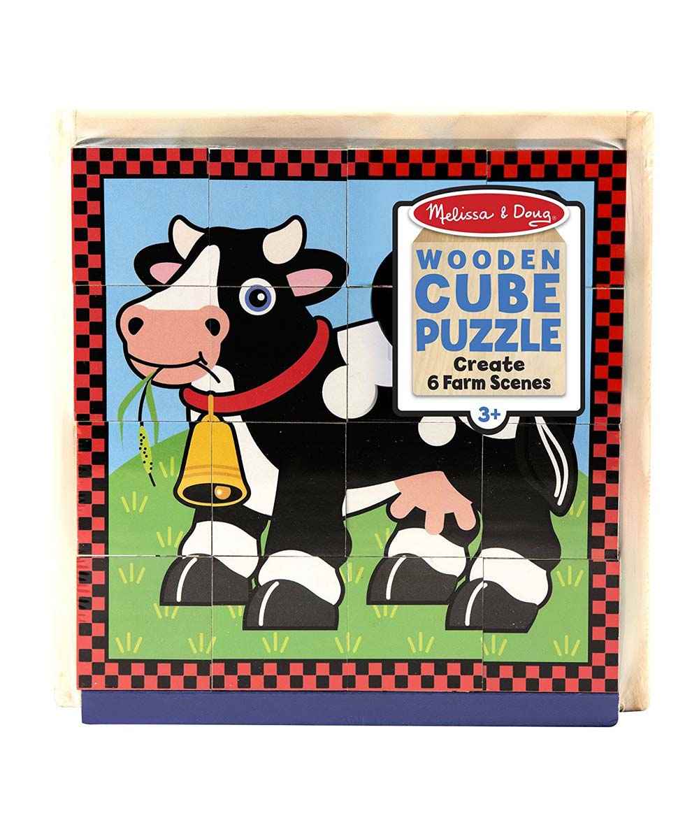 Six puzzles in one! There are 16 solid wooden cubes in this unique puzzle. Rotate the cubes in the included wooden tray to complete colorful pictures of six different farm animals. (The border design provides a helpful hint!)