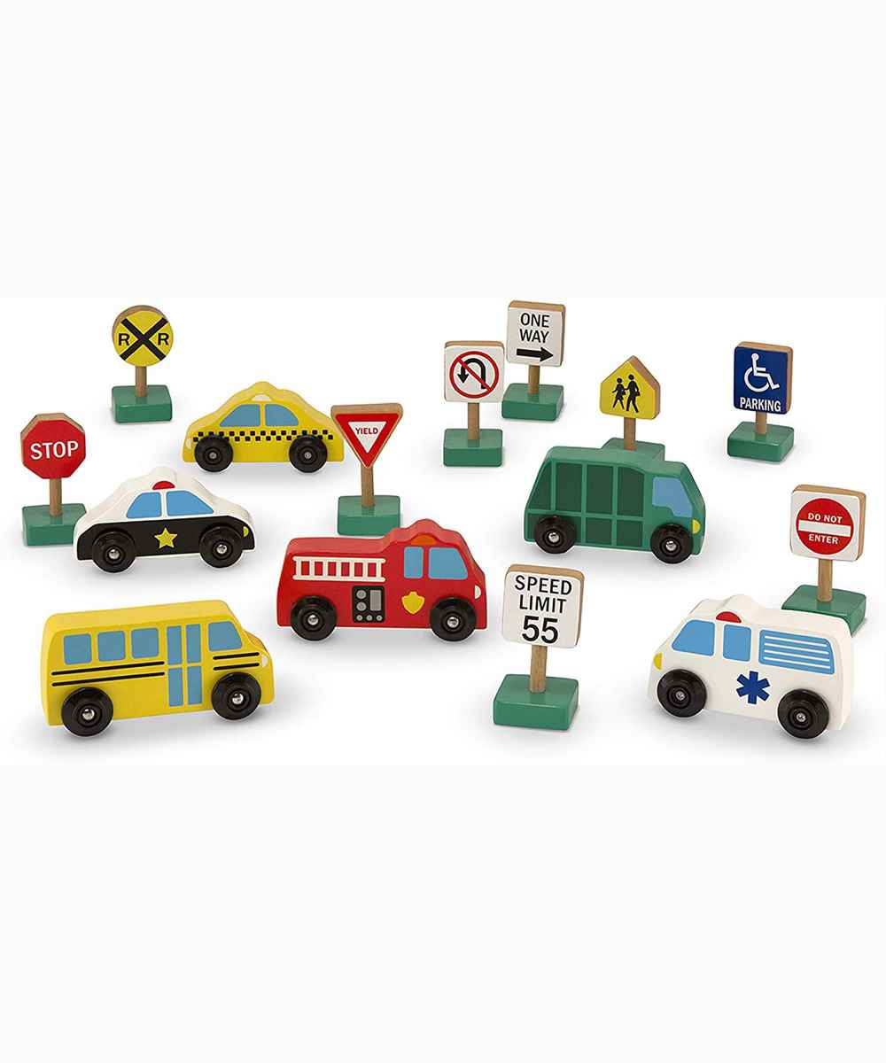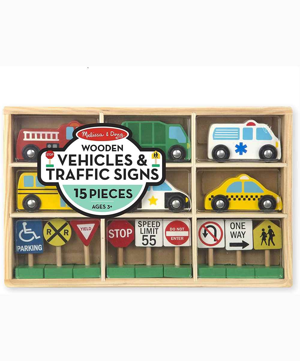 Six wooden vehicles and nine familiar signs furnish a world of travel and pretend-play fun Car-loving kids will find everything they need to set up a busy street or add to train sets and blocks: The set includes emergency vehicles, a school bus, a taxi, garbage truck and nine brightly painted traffic signs for imaginative play. The included play extensions suggest skill-building activities to improve vocabulary and sorting, too. All 15 pieces store neatly in the compartmentalized wooden box when playtime is over. For more than 30 years, Melissa & Doug has created beautifully designed imagination- and creativity-sparking products that NBC News called ?the gold standard in early childhood play.? Today, Melissa & Doug is proudly partnering with the American Academy of Pediatrics to foster early brain development and help children build important life skills through play.