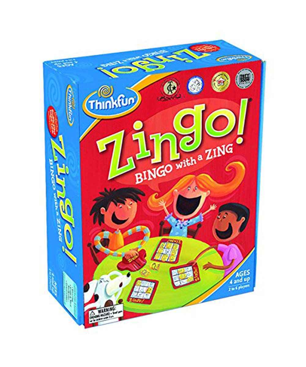a matching game that encourages pre-readers and early readers alike to match the pictures and words to their challenge cards. The Zingo! Zinger dispenses tiles and fun as young minds quickly race to be the first player with a full card and yell “ZINGO!” With two levels of play, this matching game builds language skills through fast-paced play.